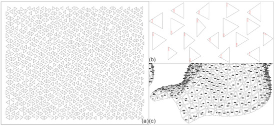 The biomimicry of the pavilion: After going through all the logic proposed by Badarnah [33] for this experiment, it is possible to point out important characteristics that relate to the natural inspiration—a snowflake. The hexagonal symmetry of a plate-type crystal was divided into 6 triangles and applied in a mesh based on 6 spheres. The nature of the different panels goes back to the uniqueness of snowflakes, considering that each panel has its own measurement and identity; for this, the RhinoNest tool was used within the Rhinoceros modelling software, which allowed for the pieces to be mapped (Figure 8). As far as the metal structure is concerned, it supports the panels and forms the pavilion just as branches provide structure to snowflakes.