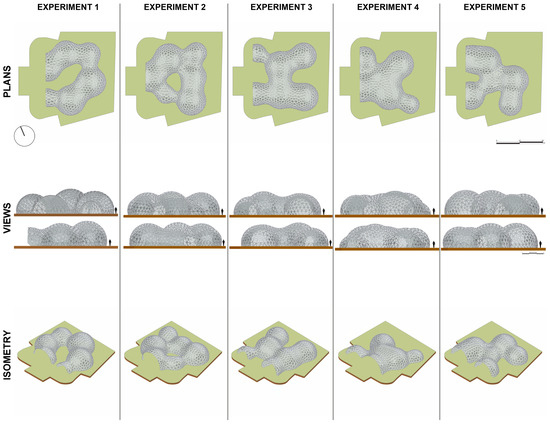 The bio-inspired architectural pavilion project was made up of five experiments developed in Grasshopper as a parametric computer environment (Figure 9 and Table 1). However, these experiments have only been recorded as a presentation of the diversity of the results that can be achieved, when in fact countless proposals can be developed from the different possible combinations of implemented parameters.