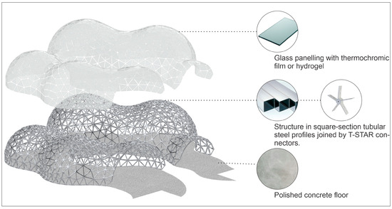 In terms of materials (Figure 11), the pavilion consists of a metal structure made of square tubular profiles with a square-section of 50 × 50 mm. This structure incorporates a robust system of T-STARi connectors in a star shape, joined by flat steel bars that are welded and bolted together. The roof is composed of laminated glass panels with a thermochromic film or hydrogel overlay, adhered to the metal structure using VHBii tape. The flooring would employ polished concrete techniques for a durable and refined finish.