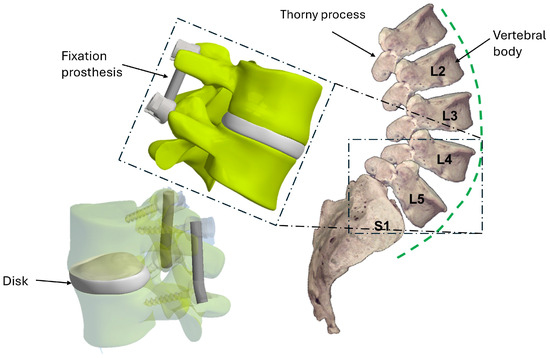 The analysis of the biomimetic behavior of a PEEK-based spine fixation system was conducted using the finite element method (FEM). For this purpose, the real object has to be simplified to create a numerical model. In this study, a patient-specific model was generated, consisting of two vertebrae in the L4-L5 segment [33,34]. This functional spinal unit (FSU) was chosen because clinical studies have shown that the L4-L5 level is one of the levels that is most affected by lumbar degenerative disease [42,43,44]. Furthermore, epidemiological studies have highlighted that the L4-L5 level exhibits a higher incidence of disk herniation and spinal stenosis compared to other lumbar levels, making it a focal point for research on spinal fusion and fixation materials [45].