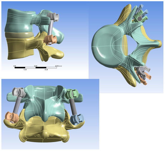 Once the two vertebrae were assembled, the model was saved in STL format. Subsequently, the geometry was imported into Autodesk Meshmixer 3.3.15 to convert the surface mesh into solid elements and save the model in STP format. Finally, the geometry was imported into SpaceClaim R2023 to separate the vertebrae and insert the pedicle screws. The FEM model was reviewed and processed in the finite element software ANSYS R2023. At this stage, the geometry was imported into ANSYS, where the necessary working surfaces for defining the model were created in the Part module, as shown in Figure 2.