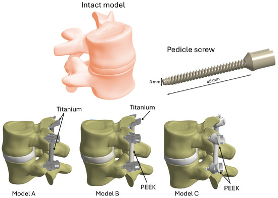 To overcome the disadvantages of titanium devices due to their high stiffness, less rigid implants made of PEEK have been developed. Biomechanical studies analyzing the properties of fixation with PEEK and titanium rods have reported similar spinal stability for the two materials [67,68,69,70]. Wang et al. [53] found that PEEK rods transferred less stress to adjacent segments. In a comparative biomechanical study by Li et al. [52], it was found that PEEK rods reduced the stress on the screw–rod system by approximately 50% compared to titanium. In addition, the use of PEEK pedicle screws showed benefits, particularly in reducing the risk of screw loosening, as shown in the analysis by Oikonomidis et al. [71]. Clinically, PEEK has also led to significant improvements. For example, in a retrospective study by Ho et al. [72], the results indicated that PEEK pedicle screws significantly improved postoperative CT imaging and reduced artifact indices compared to titanium. Qi et al. [73] compared 20 patients with PEEK rods and 21 patients with titanium rods, and found no significant differences in fusion rates or clinical outcomes. However, the effect of stress shielding was not evaluated by comparing different models in most of the studies found in the literature. In order to fill this gap, the aim of this study was to compare three interbody fixation systems. Specifically, in Model A, both the screws and rods were made of titanium, while in Model B, the screws were made of titanium and the rods were made of PEEK. For Model C, PEEK was considered for both components. The analysis, performed using the finite element method, evaluated the effect of stress shielding from a numerical perspective, but neither in vivo nor in vitro.