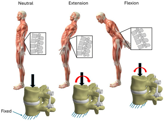 The loads applied to the two vertebrae correspond to the phases in which a person is in the neutral position, in extension and in flexion. Rotational loads should also be considered, but they have a lower intensity than loads in the previously defined positions, as shown by some FEA studies [52,53,54]. Therefore, only the loading modes shown in Figure 4 were considered in the comparative analysis performed here. These conditions correspond to a 30-year-old person weighing 95 kg. Table 2 shows the numerical values of the loads assumed in the three phases, applied to the upper surface of the L4 vertebra. Meanwhile, the lower part of the L5 vertebra was constrained in all directions [49,55].