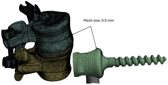 After assigning the material properties and the loading and boundary conditions, the 3D model of the fixed L4-L5 assembly was converted into finite elements. Given the complexity of the geometry, tetrahedral elements were selected, which ensure a higher level of accuracy compared to hexahedral elements. To ensure the accuracy of the results obtained from the finite element analysis (FEA), a mesh convergence study was conducted, setting an acceptable percentage variation of 1% between the results of successive meshes. Three different meshes were hence created, including 100,000, 280,000, and 300,000 elements, respectively. The von Mises stress distributions computed for each mesh were compared. Since the largest stress variation between the 280,000 element and the 300,000 element meshes was less than 1%, convergence was considered to be achieved. Consequently, a final mesh including 289,456 elements was selected for the analysis, utilizing a mesh size of 0.5 mm. This approach is consistent with findings reported in the literature [56,57,58,59,60]. The finite element model of the L4-L5 vertebrae and the implant is shown in Figure 5.
