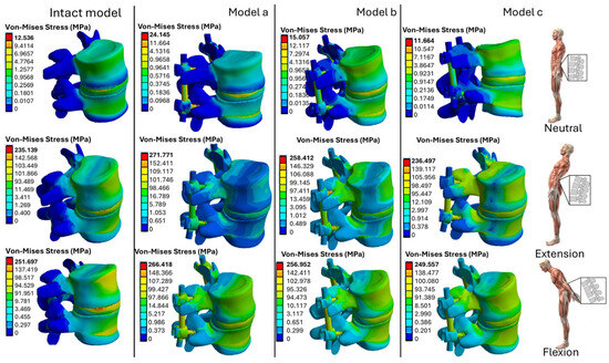 The numerical results for the stress distribution in the L4–L5 vertebrae, intervertebral disk, and prosthetic devices, such as the pedicle bar and pedicle screws, are shown in Figure 6. The stress values in three different positions (neutral, flexion, and extension) for the three models (A, B, C) were compared with their counterparts for the intact (baseline) model.