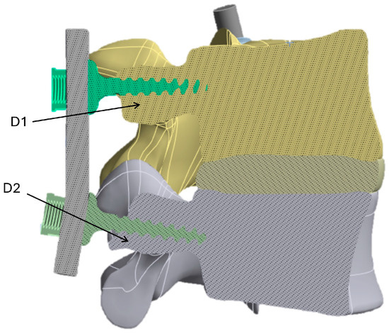 An implant that stresses the bone structures differently than the intact model may cause stress shielding and bone density loss, because the bone near the pedicle screw, where the highest stresses are exchanged, is not stimulated, and hence may resorb. In contrast, an implant that distributes stresses more evenly may promote bone growth at the screw surface and full osteointegration. To analyze stress shielding, the representative control locations (D1 and D2) near the bone/screw interface, where stress shielding is most likely to occur, were considered (see Figure 7).