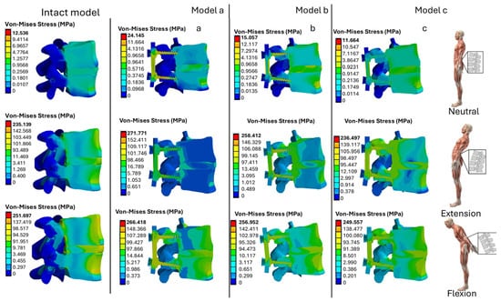 The finite element model developed in this study for the fixed L4-L5 spine segment was validated by comparing the Von Mises stress distributions in the vertebrae computed for the three fixation models and for the intact (baseline) model. The validation process also relied on studies previously published in the literature [49,52,53,54,55] which evaluated the stresses transmitted by the prosthesis on the FSU; remarkably, the results obtained in this study showed good consistency with those reported in the literature.