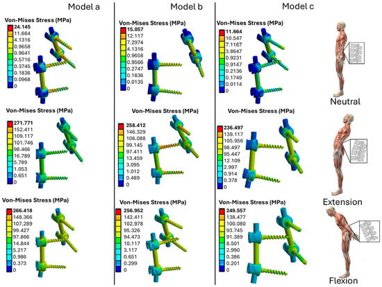 Compared to the neutral position, the results show an increase in stress during flexion and extension. Model A, with titanium rods and pedicle screws, shows the highest stress values, while Model C, with PEEK components, shows the lowest stress level (11.664 MPa in neutral position). In extension, Model A reaches 271.771 MPa, compared to 24.145 MPa recorded in neutral position. This indicates that the inclination of the body results in insignificant stresses, due to a bending moment, relative to the neutral position. In addition, the use of polymeric materials such as PEEK reduces stress concentration areas and improves stress distribution between the vertebrae and the prosthesis.