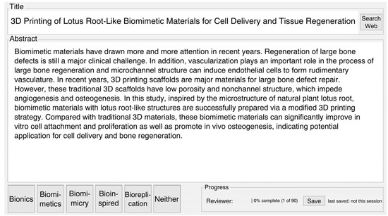 The GUI for assigning abstracts to the categories bioinspired, biomimetics, biomimicry, bionics, or neither.