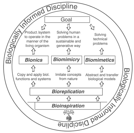 Fayemi et al. [25] discussed different terms that describe the process of ’learning from nature’, such as bioinspiration, biomimicry, bionics, and biologically inspired design. The authors mentioned that these terms are often treated as synonyms in the scientific literature and gave some examples [2,26,27]. Fayemi et al. [25] considered this appropriate when referring to the end result of these approaches, namely, an invention made possible by knowledge derived from nature. However, they qualified this by saying that differences arise when considering the scope of each term and the development processes. They used the definitions of key terms from the literature but did not explore whether these different areas could be clearly separated. Instead, they focused on biomimetic working models, for which they developed a problem-driven process model. In addition, they proposed a utility tree to guide users in selecting tools based on expertise, making biomimetics more accessible and encouraging its practical implementation [25].