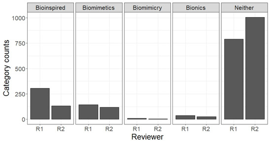 All information except for the publication and the abstract were removed, and the remaining data were copied into CSV files. The CSV files were imported into R (v 3.5.0), and a code was used that displayed each abstract and title using a graphical interface that also displayed five buttons labelled “Biomimetics”, “Biomimicry”, “Bionics”, “Bioinspired”, and “Neither”. The code generated a new CSV file with the abstract title, the abstract, the name of the reviewer, and the label of the button that was clicked after the abstract had been categorised by the reviewer (Figure 1). The code for the GUI and list of used libraries are available in the supplementary material.