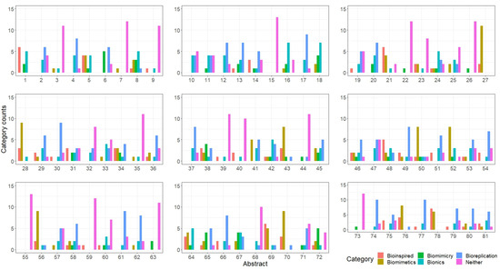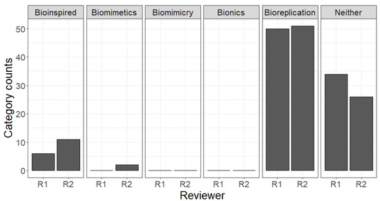 The analysis of the distribution of responses when assigning abstracts to the categories bioinspired, biomimetics, biomimicry, bionics, neither, or the added category bioreplication.