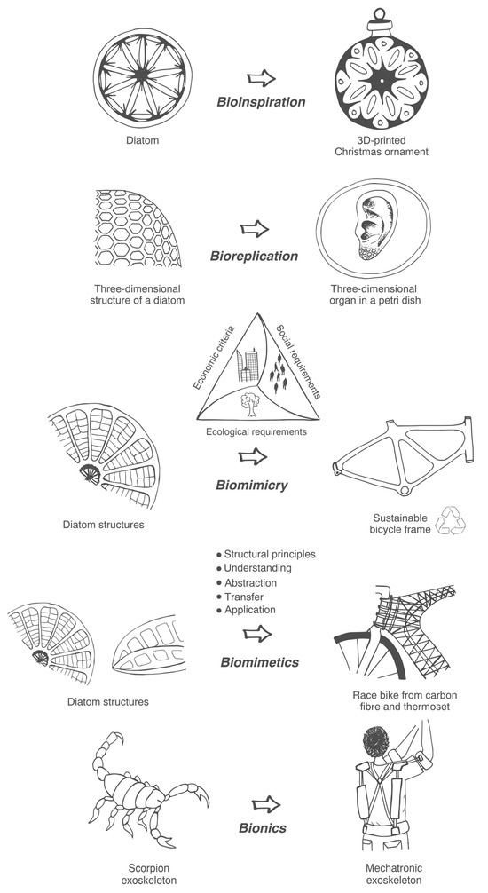 Visualisation of the concepts of bioinspiration, bioreplication, biomimicry, biomimetics, and bionics.