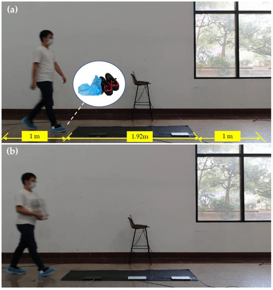 In the experiment, participants began walking from a point one meter in front of the pressure sensing mat to avoid acceleration effects when starting to walk. The stopping position after passing over the mat was also set one meter from the end of the mat. Throughout the testing process, participants were instructed to walk naturally while maintaining a forward gaze [21]. Each participant was instructed to complete thirty trials of walking at a normal pace on a piezoresistive pressure sensing mat system, where a round trip counted as one trial, as shown in Figure 1a. After completing thirty trials, participants were asked to carry a 500 g object while walking an additional ten trials, as shown in Figure 1b, to observe whether carried additional items would affect recognition rates.