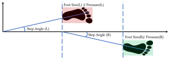 The gait measurement parameters in this experiment included three key features: step angle, plantar pressure, and foot size [22], as shown in Figure 2. By utilizing region of interest (ROI) digital image processing techniques [23], the participant’s pressure sensing values recorded during a single traversal of the mat were aggregated.