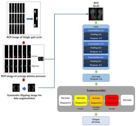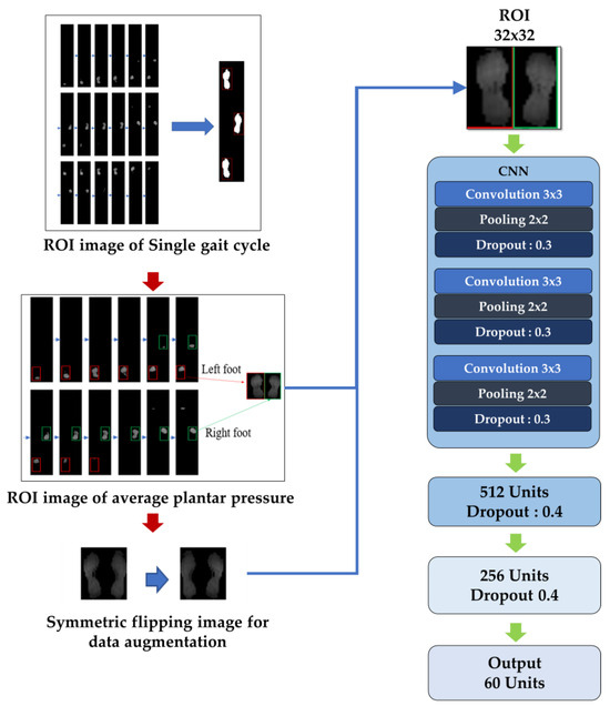 As previously mentioned, obtaining an average plantar pressure image required both spatial and temporal information [21,24,25]. Initially, participants walked on the sensing mat, followed by summing the pressure values recorded on the mat. Subsequently, spatial information was acquired using ROI techniques. The obtained ROI area was then divided by the frame count based on the gait cycle. By extracting both spatial and temporal information, images sized 32 × 16 pixels were created for each foot. These images were then combined to form a single image of size 32 × 32 pixels, representing information from both feet. This feature image provided insights into pressure distribution, foot angles, and foot sizes.
