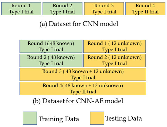 To expand the application domain of the gait recognition model developed in this study, the 60 participants were divided into 48 known subjects and 12 unknown subjects to evaluate the system’s performance in distinguishing between known and unknown individuals. The training process began with classification using a convolutional neural network (CNN), followed by dimensionality reduction in the feature vectors through an autoencoder (AE). Ultimately, all feature vectors were stored in a database. The third-round data from the Type I trial of known subjects and data from the Type II trial were also used as additional testing data.