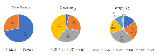 This experiment involved a total of 60 participating subjects, comprising 17 females and 43 males. For this study, fabric shoes were provided to the participants to control for variables, as they might otherwise wear shoes with different sole patterns. Shoe sizes were indicated using US sizing. The distribution of participating subjects according to their shoe sizes is as follows: 2 participants wore size 3, 15 participants wore size 4, 19 participants wore size 7, and 24 participants wore size 10. The gender ratio of the participating subjects, along with the distribution of shoe sizes and body weights, was illustrated in Figure 6.