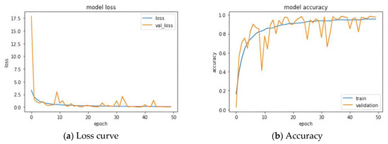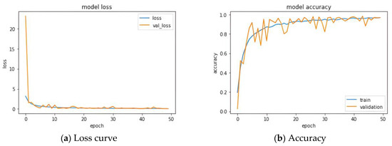 The model parameters were configured with a learning rate of 0.001, an epoch count of 50, a batch size of 16, and a validation split of 0.1. Figure 9 presents the loss and accuracy during the training of the model. As indicated in these figures, the training of the entire model converges around epoch 20 [34].