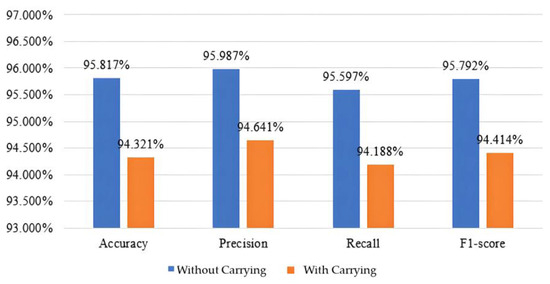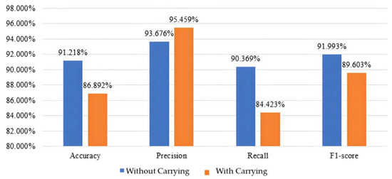 As shown in Figure 14, when no load was held, the accuracy reached 91.218%, with a precision of 93.676%, a recall of 90.369%, and an F1 score of 91.993%. In contrast, when carrying a load, the accuracy was recorded at 86.892%, with a precision of 95.459%, a recall of 84.423%, and an F1 score of 89.603%. The higher precision indicated that the model was more cautious and accurate when determining samples as positive, suggesting that it only provided positive judgments under highly certain conditions, thus avoiding excessive false positives.