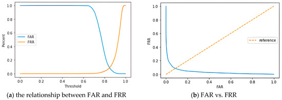 In the Type II evaluation, both known and unknown subjects were assessed. As shown in Figure 12a, the false acceptance rate (FAR) and false rejection rate (FRR) for authorized and unauthorized individuals were observed. The intersection of these two rates represented the equal error rate (EER). The threshold value was set at 0.84, at which point the balance between FAR and FRR was achieved, resulting in an EER of 12.37%.