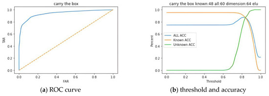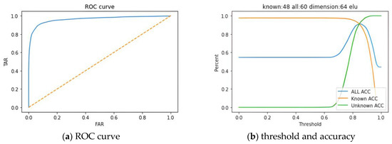 Figure 11a illustrated the ROC curve with the false acceptance rate (FAR) plotted on the x-axis and the true acceptance rate (TAR) on the y-axis. The area under the curve (AUC) was calculated to be 0.9629, indicating that the system exhibited strong classification capabilities. In Figure 11b, it was shown that as the threshold gradually increased, the accuracy of unknown subjects also rose. However, it was necessary to identify an appropriate threshold to balance the accuracy between known and unknown subjects. In this experiment, the threshold was adjusted to 0.85, as previously mentioned, which corresponded to the location of the EER. This adjustment allowed for a relatively balanced state between the accuracies of known and unknown subjects. Furthermore, when the threshold was set at 0.85, the accuracy for known subjects reached 90.83%, while the accuracy for unknown subjects was recorded at 91.71%. The overall accuracy (for both known and unknown subjects) was determined to be 91.22%. This balanced setting enhanced the system’s precision in distinguishing between known and unknown individuals.