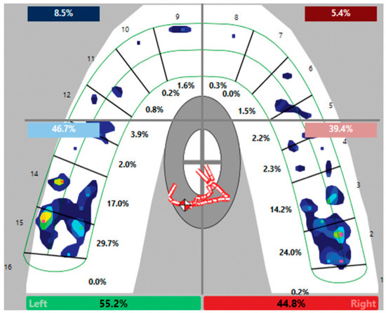 In accordance with the manufacturer’s instructions (T-Scan® III Version 7.0), participants were seated upright, and the appropriate sensor size was chosen. Ensuring the sensor was kept as parallel as possible to the occlusal plane, participants were asked to complete three chewing cycles before recording the bite force, with the sensitivity adjusted to ensure no more than three “pink peaks” at maximum intercuspation. The average of three consecutive recordings of the maximum bite forces was calculated [1].