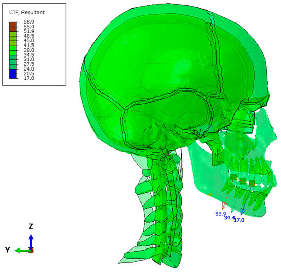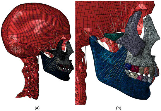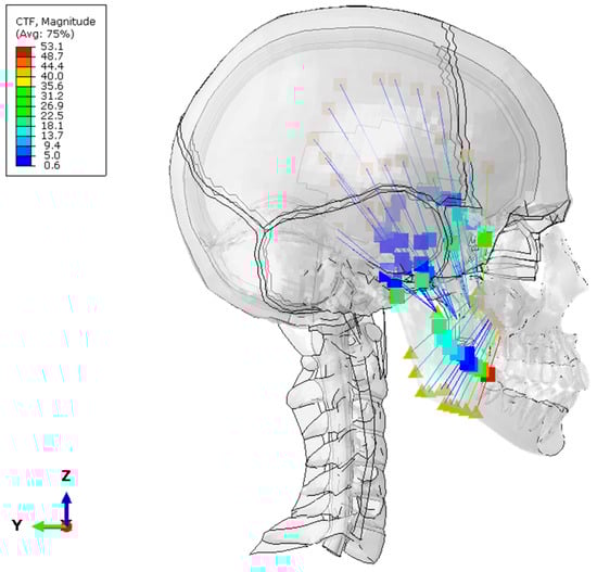 Muscles and tendons were modeled using CONN3D2 connector-type elements, where the connection between the connector and the bone is made using stiffness-free interpolation elements to distribute the load of the connector over an area of influence. The element type used to model the maxilla, zygomatic, mandible, and teeth was C3D10 second-order tetrahedra, with an average mesh size of 1–1.5 mm [17]. The remaining parts were derived from the original model according to [12,17], with first-order C3D8 hexahedral elements for the skull and first-order C3D4 tetrahedra for vertebrae and parts of complex geometry. The total number of elements was 1.68 million elements.
