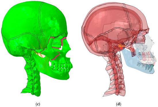 The connection between the maxilla, zygomatic bone, and the skull was made using Tie-type kinematic restraints, which rigidly connect two surfaces (Figure 2c).
