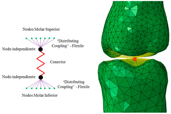 The interaction between teeth is produced by contact between the different parts that make up the denture. The parts in an optimal configuration are aligned so that the contact between the parts is optimal. In simulation models, representing this effect is very complex and requires very high mesh densities and the definition of contact stiffnesses between the different parts to obtain the contact forces accurately. This effect is also very local, referring only to the surface of the dental piece, and by applying Saint Venant’s criterion, we can replace the interaction by contact with an interaction based on flexible connectors that transmit the total contact force from one piece to another.
