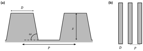 | D (µm) | H (µm) | P (µm) | ꙍ (°) |