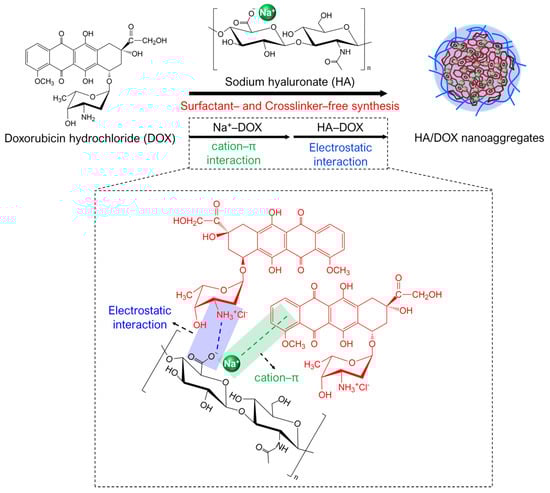 Interactions between biomolecules are critical factors in living cells. In particular, biological processes or reactions in living cells are controlled by many types of non-covalent interactions such as hydrogen bonds and ionic (electrostatic), hydrophobic, van der Waals, and cation–π interactions. These non-covalent interactions influence drug design, the production of self-assembled materials, and biological adhesion [,]. Inspired by these interactions in living systems, we propose the facile one-pot synthesis of self-assembled HA/DOX nanoaggregates via cation–π interactions (between cationic and aromatic moieties) and electrostatic interactions. Herein, the one-pot synthesis of self-assembled HA/DOX nanoaggregates was designed by the simple mixing of HA with DOX without surfactants and the chemical conjugation of DOX with HA using crosslinkers, because the aromatic moiety in DOX interacts with Na+ in HA via cation–π interactions and the electrostatic interaction of the negatively charged COO- of HA with the positively charged NH2 of DOX [,,,]. In this study, we prepared HA/DOX nanoaggregates at various molar ratios of [DOX]/[HA] by simple mixing and selected the optimized HA/DOX nanoaggregates by characterizing physicochemical properties and storage stability. Furthermore, we examined the in vitro targeting ability of the optimized HA/DOX nanoaggregates, the specific delivery of DOX into the nuclei of CD44-overexpressing cancer cells, and their anticancer effects against CD44-overexpressing cancer cells using annexin V staining and the transferase dUTP nick-end labeling (TUNEL) assay.