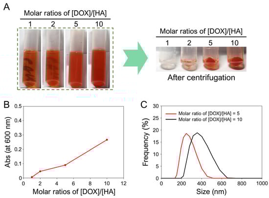 Optimization for the synthesis of HA/DOX nanoaggregates via the simple mixing of HA with different moles of DOX. (A) Photographs of the prepared HA/DOX nanoaggregates after the simple mixing of HA with different concentrations of DOX. (B) Turbidities of HA/DOX nanoaggregates prepared at different molar ratios of [DOX]/[HA]. (C) Hydrodynamic particle size distributions of HA/DOX nanoaggregates prepared at [DOX]/[HA] molar ratios of 5 and 10.