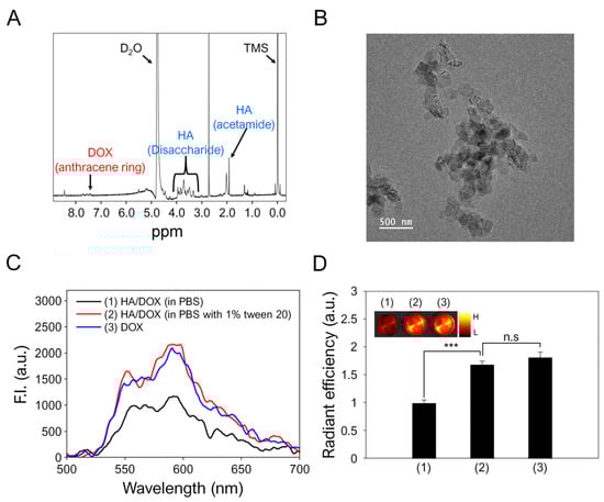Characterizations of the optimized HA/DOX nanoaggregates. (A) 1H-NMR spectrum and (B) TEM image of HA/DOX nanoaggregates. Inset: Magnified image of HA/DOX nanoaggregates. Scale bar: 500 nm. (C) Fluorescence spectra (Ex = 480 nm). (D) Fluorescence images and quantitative fluorescence intensities of (1) HA/DOX nanoaggregates (in PBS), (2) HA/DOX nanoaggregates (in PBS with 1% Tween 20), and (3) DOX in DW. *** p < 0.001. n.s.: no significance.