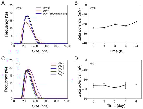 The stability and storage stability of the HA/DOX nanoaggregates were examined by monitoring particle size and zeta potential values using a particle size analyzer (HORIBA) and zetasizer (Malvern Panalytical Ltd., Malvern, UK), respectively. The hydrodynamic mean sizes, Z-average sizes, and PDI values of 10-fold diluted HA/DOX nanoaggregates as described in the Section 2.2 were determined at room temperature. After 1 day of incubation, the particle size distributions were measured before and after vortexing for 10 s. Additionally, the zeta potential values of HA/DOX nanoaggregates stored at room temperature were measured at scheduled time intervals (0, 1, 3, 6, and 24 h). To further investigate the storage stability of the nanoaggregates, the hydrodynamic mean sizes, Z-average sizes, PDI values, and zeta potential values of the HA/DOX stock solution obtained after purification were monitored at scheduled intervals (0, 1, 2, 4, and 6 days) during storage at 4 °C.