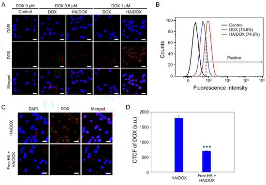 In vitro intracellular internalization of DOX and HA/DOX nanoaggregates against SCC7 cells. (A) Captured fluorescence images of SCC7 cells treated with free DOX (0.5 and 1 μM DOX) and HA/DOX (equivalent to 0.5 and 1 μM DOX). Scale bar: 20 μm. (B) Quantitative fluorescence intensities measured by flow cytometry of SCC7 cells treated with DOX (1 μM) and HA/DOX (equivalent to 1 μM DOX). (C) Fluorescence images and (D) quantitative fluorescence intensities for intracellular localized DOX in nuclei of SCC7 cells after treatment with HA/DOX (equivalent to 1 μM DOX) with or without free HA pretreatment. Scale bar: 20 μm. *** p < 0.001.
