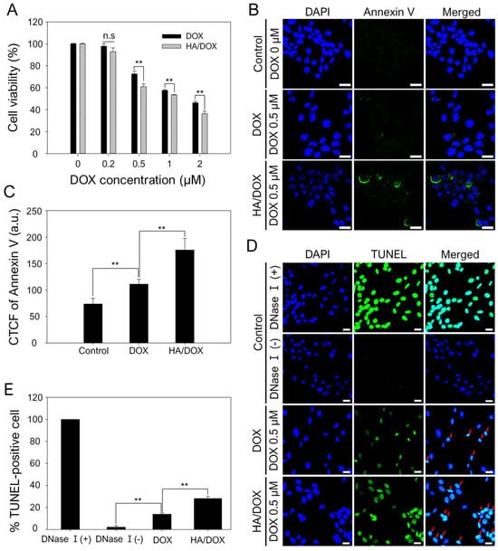 In vitro anticancer effects of HA/DOX nanoaggregates on SCC7 cells. (A) Cytotoxic effects of DOX and HA/DOX nanoaggregates on SCC7 cells. (B) annexin V-stained fluorescence images and (C) quantitative analysis of SCC7 cells treated with DOX (0.5 μM) or HA/DOX nanoaggregates (equivalent to 0.5 μM DOX). Scale bar: 20 μm; ** p < 0.01. (D) Fluorescence images and (E) quantitative analysis of TUNEL-stained SCC7 cells treated with no treatment (negative control, without DNase I), DNase I (positive control), DOX (0.5 μM), or HA/DOX nanoaggregates (equivalent to 0.5 μM DOX). ** p < 0.01.; n.s.: no significance.