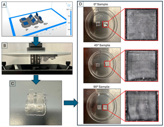 The specimens underwent post-processing that included ultrasonic cleaning in isopropyl alcohol for five minutes to remove any uncured resin residue. They were then dried using compressed air. Figure 1C shows the samples at the end of this phase. Finally, the samples were placed in 50 mm diameter Petri dishes, as illustrated in Figure 1D.