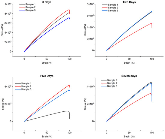 Analyzing the results, it can be observed that, after two days of water immersion, Young’s modulus underwent a significant reduction, equal to 27.02%. This decrease continued in the following days, reaching a decrease of 53.43% after five days. After this phase, a stabilization trend was observed, with an overall reduction of 50.31% on the seventh day, suggesting a convergence phase of the Young’s modulus.