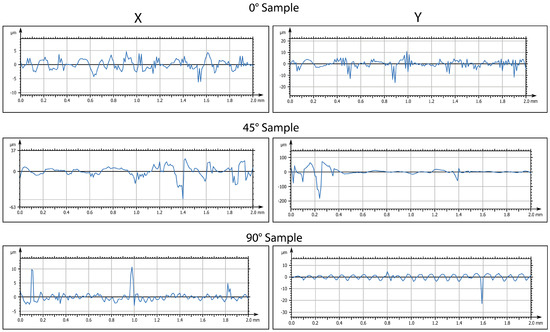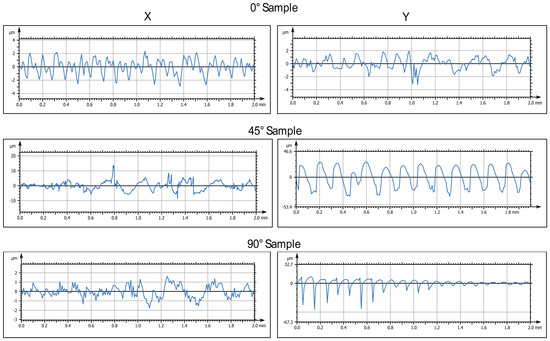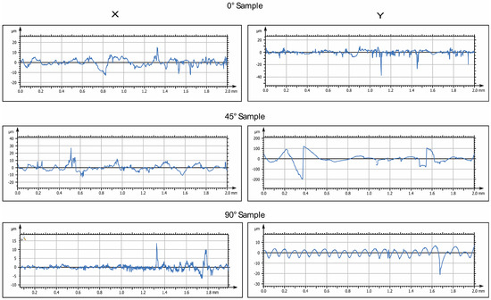 Two-dimensional surface analysis of samples after thermal exposure at −80 °C: typical roughness profiles (Ra, µm). Representative images of roughness profiles (Ra, µm), taken by a Mitaka noncontact surface profiler, for samples printed at three different orientations (0°, 45°, and 90° with respect to the printing plane).