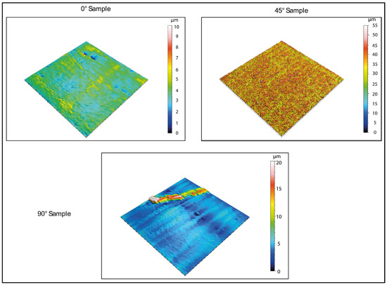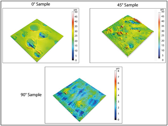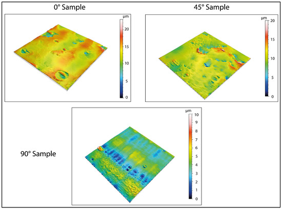 From the results obtained, an increase in the surface roughness was observed for all the orientations considered. However, this increase was more pronounced for the sample printed at 0°. The increase in roughness was confirmed by 3D maps (Figure 6). It is important to note that this increase was not uniform but was instead concentrated in specific areas of the specimen, corresponding to porous formation.