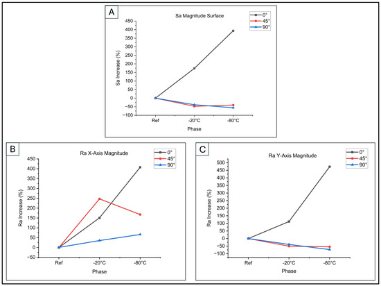 As depicted in Figure 9B (building direction along the X-axis), samples at 0° and 45° orientations demonstrated a marked rise in linear roughness Ra% following low-temperature treatment. The increase was particularly notable, reaching 150.83% and 247.16% after exposure at −20 °C, and 407.5% and 167.61% following treatment at −80 °C. This phenomenon can be explained by the condensation and rigidification of polymer chains at reduced temperatures, resulting in heightened surface irregularity, according to [37]. Conversely, the 90° sample exhibited less pronounced roughness increases, with values of 35.42% initially (−20 °C) and 66.15% subsequently (−80 °C).