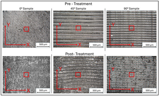 Comparative analysis of the sample surfaces before and after treatment, utilizing 160× magnification with the Hirox microscope, revealed macroscopic variations, particularly for 0° samples (Figure 10). We observed that the 0° sample exhibited plastic deformation in the central area. In this region, a marked increase in surface roughness was observed compared to the other areas, which appeared to be more homogeneous. This phenomenon can be attributed to the presence of surface defects or printing imperfections, which facilitate the accumulation of water, thus resulting in the plastic deformation of the surface.