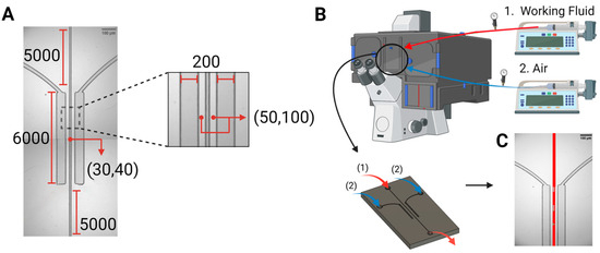 The devices were placed in the microscope system, with inlets connected to two syringe pumps for the air stream (blue) and working fluids (red). Two types of blood-equivalent solutions were injected into the channels at realistic flow rates, mimicking the circulatory system [27,28]. The rheological properties of the working fluid, widths of the vascular channel, and thicknesses of the vascular walls were evaluated in the central channel, which was undergoing uniform pressure variations along its entire length. This is particularly important because the onset of gas embolism is sudden and has never been observed and recorded in close to real-life scenarios, and it is, at least in the first instance, a predominantly physical phenomenon that requires precise control and observation of fluid behavior. The values of the pressure drop for these two types of fluids, in two channel widths, and for the full length of the microfluidic system, or the 6 mm length guarded by pressure chambers, respectively, are presented in Table 1.
