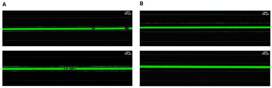 Experimental setup. The experimental setup (Figure 1B) consisted of an inverted confocal microscope (Olympus IX83 fluorescence microscope, Olympus Corporation, Tokyo, Japan), two programmable syringe pumps, i.e., Pump 11 Elite Syringe Pumps, Harvard Apparatus (Holliston, MA, USA) pumping liquid, and a BD Plastipak™ (Franklin Lakes, NJ, USA) syringe pumping air. Using the first syringe pump, the working fluid was injected, from a reservoir at atmospheric conditions, into the main channel at flow rates similar to real blood flow, i.e., 20 µL/h and 35 µL/h for the 30 µm and 40 µm widths, respectively [30,31]. The second pump was used to exert varying levels of pressure on the main channel, by injecting 1 to 20 mL of air into the bilateral pressure chambers at 100 mL/h. To calibrate the pressure drop in the central channel with fluid flow, and the pressure achieved in the lateral pressure chambers, control experiments were run with the microfluidics systems assisted by manometers (Bidirectional Microfluidic Flow Sensor, Fluigent, Paris, France).
