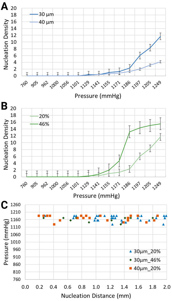 When the channel width increased from 30 μm to 40 μm while using the same blood-mimicking solution at 20% equivalent hematocrit concentration, the nucleation density exhibited an upward trend for increasing volumes of air injection, but it remained smaller in comparison with the smaller channel width. At 1170.4 mmHg and 1208.4 mmHg, the bubbles emerged with nucleation densities of 1.33 and 8.33 for the 30 μm channel, in comparison with 0.83 and 3.17 for the 40 μm channel.