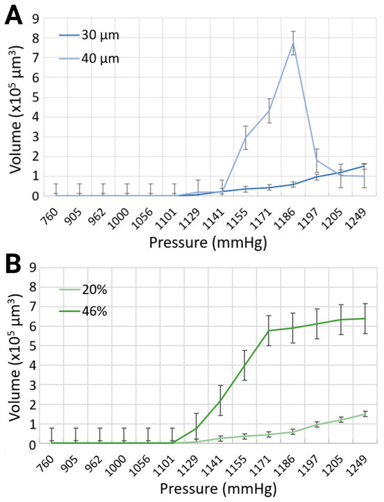 Comparison of maximum bubble volumes in (A) 30 μm and 40 μm channels with 20% blood-mimicking solution, and (B) 30 μm channel width with 20% and 46% blood-mimicking solutions.