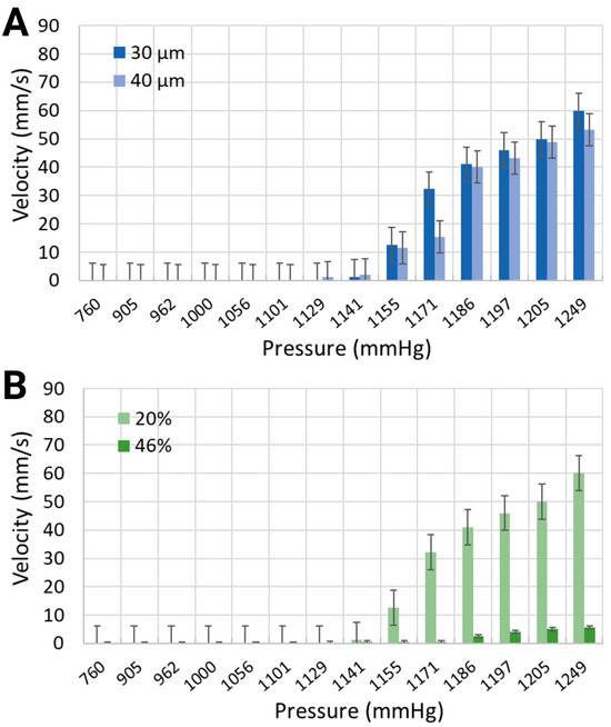 The mean velocity of generated microbubbles in 30 μm channels was larger for the synthetic blood solution at 20% hematocrit level than for the synthetic blood solution at 46% hematocrit level (Figure 6). For local pressure levels of 1170.4 mmHg, 1185.6 mmHg, and 1193.2 mmHg, the average velocities were 32.26 mm/s, 41.02 mm/s, and 45.97 mm/s for the 20% equivalent hematocrit concentration, as opposed to 0.46 mm/s, 2.5 mm/s, and 4.73 mm/s for the 46% equivalent hematocrit concentration. Working fluids with smaller viscosities are typically associated with reduced resistance to flow, thereby enabling bubble motion at higher speeds [49]. The 40 μm width channels, containing a synthetic blood solution at 20% hematocrit level, exhibited slightly slower bubble motion than smaller channel widths. The mean velocities were 15.42 mm/s, 40.15 mm/s, and 43.21 mm/s for the same applied pressures.