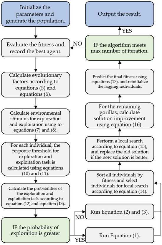 where represents the candidate position in iteration; is the gorilla position; , and are random values ranging from 0 to 1; is a preset parameter ranging from 0 to 1; and represent the bounds of variables; and are randomly selected gorillas; , and are process parameters whose calculation processes described in detail in [10].