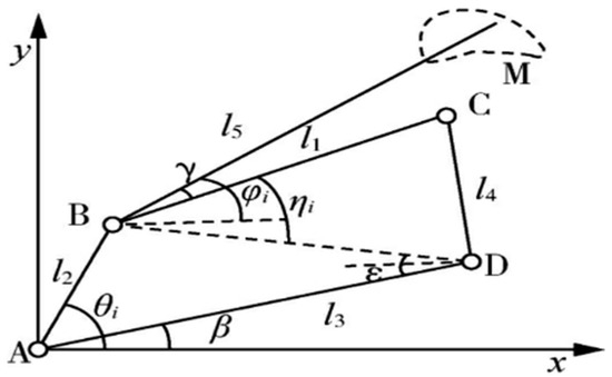 From the geometric relationship shown in Figure 1, it can be seen that when the position of point A is fixed, the trajectory of the point M on the connecting rod BC depends mainly on the length l1–5 of each connecting rod and the angular parameter , where is the initial angle between AB and AD, so the design variable is: